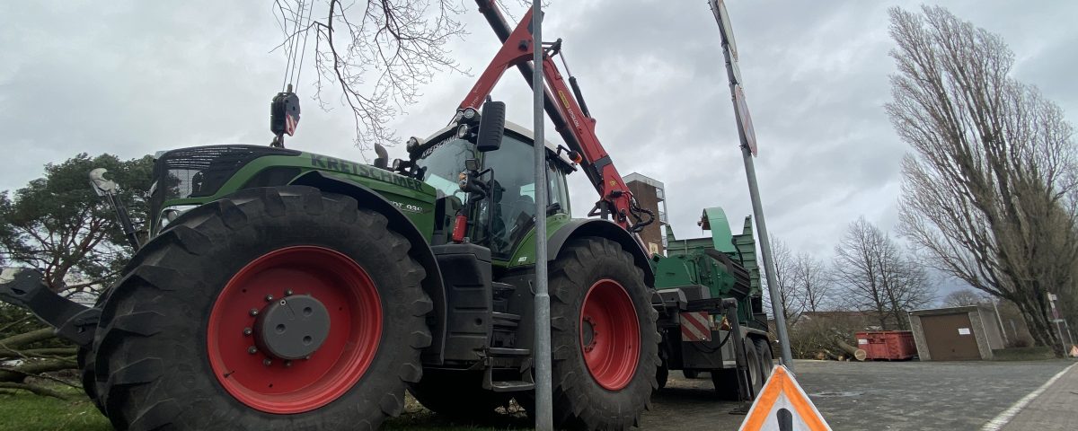 6. März 2022In dieser Woche war es soweit. Nach Jahren der politischen Gespräche und etlichen Planungsrunden ist der Stein des Neubaus von unserem Feuerwehrhaus in der Straße „Am Seelberg“ sichtbar ins Rollen gekommen. Zwar werden wir noch für ein paar Wochen an unserer bisherigen Unterkunft stationiert sein, doch vorbereitend für die Abriss- und Neubauarbeiten wurden am vergangenen Montag und Dienstag die Bäume und Sträucher gefällt, welche im Baufeld standen und daher nicht erhalten werden können. Diese Arbeiten wurden von einer beauftragten Fachfirma durchgeführt, welche die Bäume auch gleich vor Ort, mittels eines starken Häckslers, zerkleinert hat. Die Maßnahme wurde mit Hilfe eines Autokrans unterstützt. Völlig mühelos hievte dieser ganze Baumstücke über das Feuerwehrhaus hinweg und legte sie vor dem Häcksler ab.