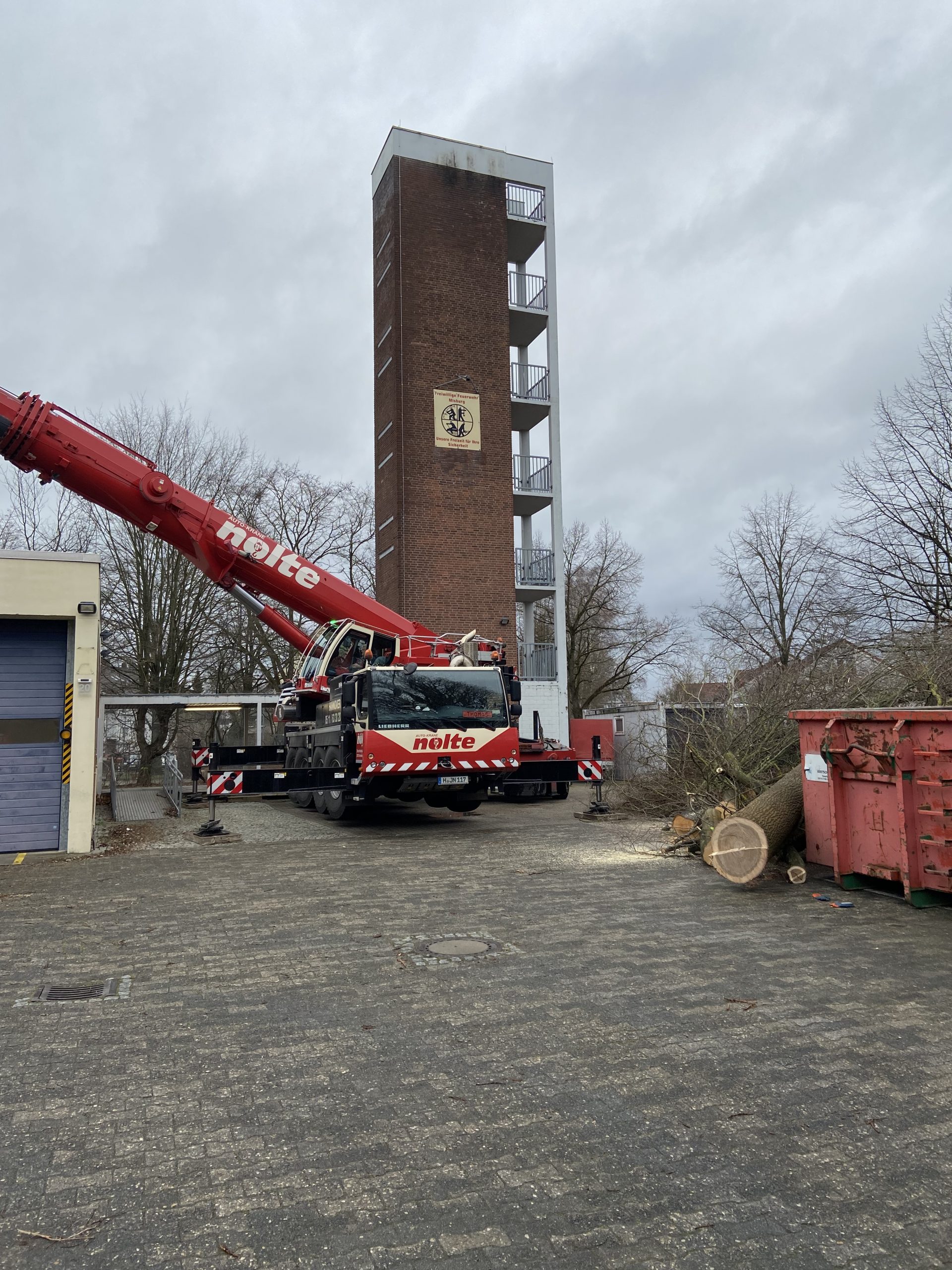 6. März 2022In dieser Woche war es soweit. Nach Jahren der politischen Gespräche und etlichen Planungsrunden ist der Stein des Neubaus von unserem Feuerwehrhaus in der Straße „Am Seelberg“ sichtbar ins Rollen gekommen. Zwar werden wir noch für ein paar Wochen an unserer bisherigen Unterkunft stationiert sein, doch vorbereitend für die Abriss- und Neubauarbeiten wurden am vergangenen Montag und Dienstag die Bäume und Sträucher gefällt, welche im Baufeld standen und daher nicht erhalten werden können. Diese Arbeiten wurden von einer beauftragten Fachfirma durchgeführt, welche die Bäume auch gleich vor Ort, mittels eines starken Häckslers, zerkleinert hat. Die Maßnahme wurde mit Hilfe eines Autokrans unterstützt. Völlig mühelos hievte dieser ganze Baumstücke über das Feuerwehrhaus hinweg und legte sie vor dem Häcksler ab.